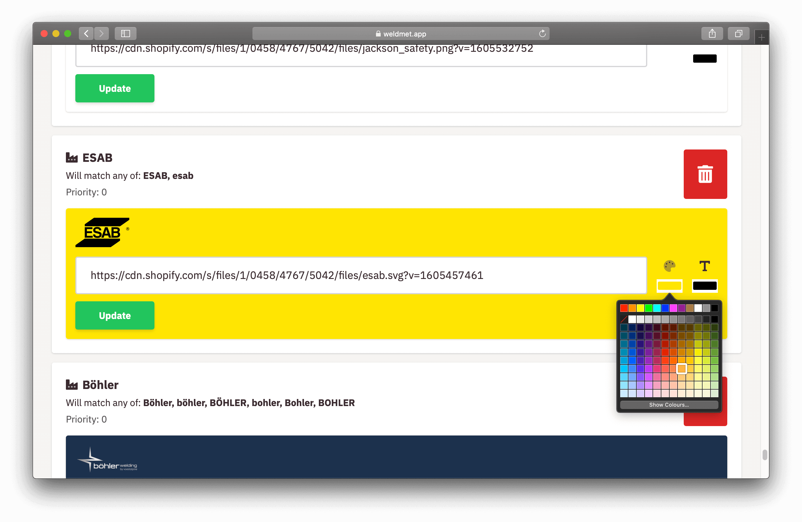 Instead, I opted to create a set of small internal tools we called the Weldmet Toolbox. For instance, one app was designed to associate manufacturer branding with each product, automatically tagged by the presence of brand-specific keywords: