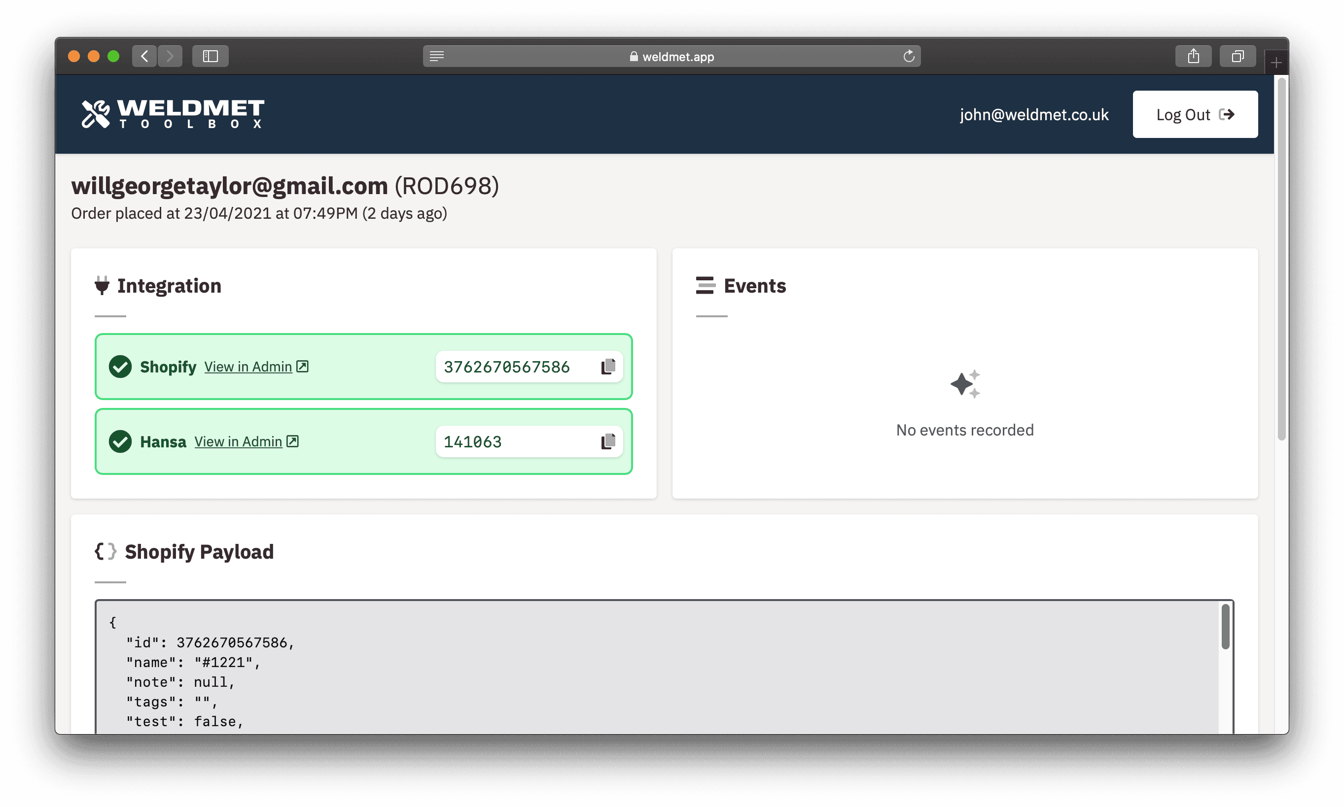 Fortunately, once I had scoped out most of the quirks of the API, I sealed those horrors inside a plain old Ruby object and exposed a more rational set of methods for ongoing development. To keep an eye on things, the first internal tool I built for Weldmet simply monitored the state of the integration, and surfaced event data. In conjunction with Sentry, this helped me to react quickly to unforeseen edge cases that would have otherwise been prevented through adequate documentation and the availability of a staging environment in Hansa.