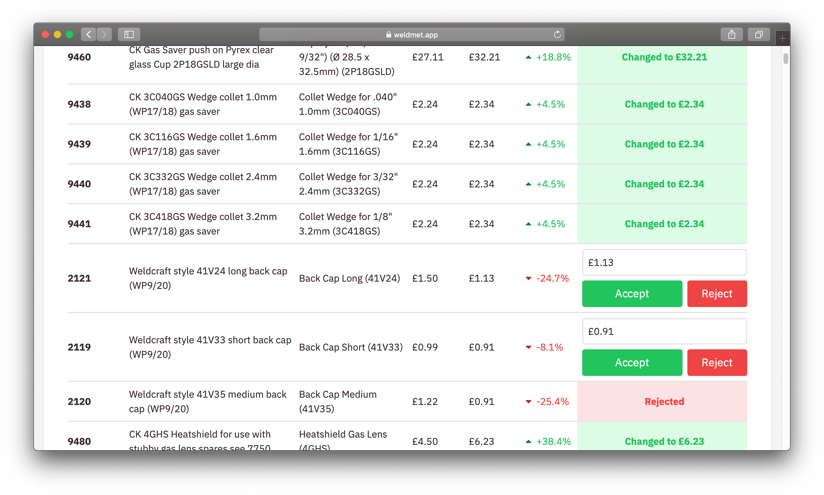 To address this, I developed a tool allowing staff to upload a basic CSV file. The system then attempts to match the manufacturer's code using regular expressions that correspond with their part number schema. Staff are presented with a list of suggested price changes, which they can then accept, modify, reject, or defer in batches. This solution has reduced the time spent each quarter from three days to just one.